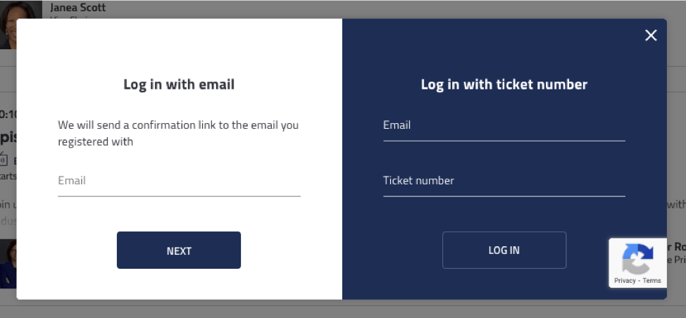 You must be logged in to join the sessions, if you are not when you click the “Broadcast” button you’ll be prompted to login. Once you click “Login” a new page will open asking for the email address used to register your ticket, then you’ll be sent your unique login link to access the event.